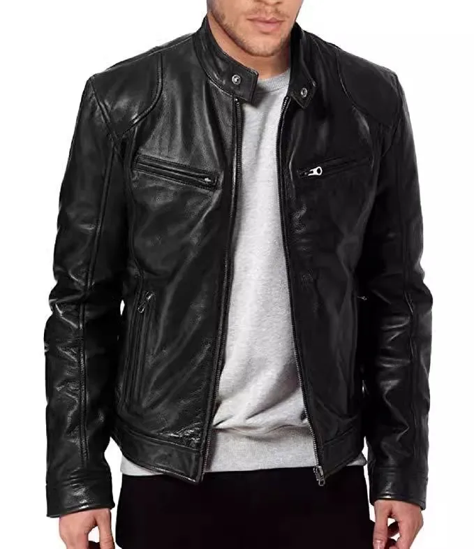 Men's Leather Jacket Men's Stand-up Collar Zipper Biker Leather Jacket Casual